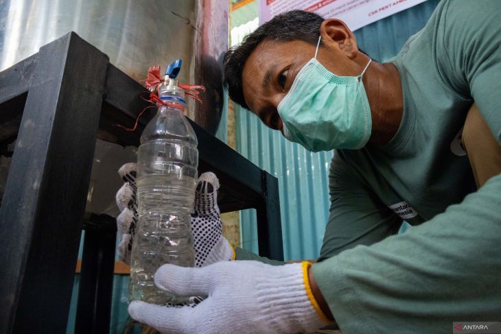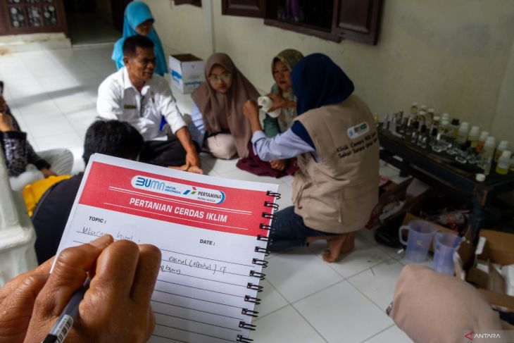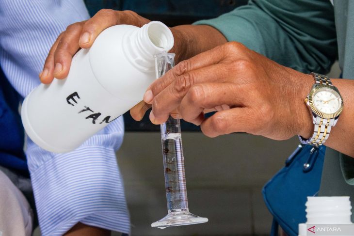 Anggota Kelompok Usaha Kompos Sejahtera Bersama (Ukasema) mengamati bioetanol hasil penyulingan jerami padi di Nagari Padang Toboh Ulakan, Kabupaten Padang Pariaman, Sumatera Barat, Selasa (16/9/2025). Parfum dengan campuran bioetanol jerami ini merupakan hasil kolaborasi Pertamina dengan Universitas Andalas.(ANTARA/Muhammad Zulfikar)Anggota Kelompok Usaha Kompos Sejahtera Bersama (Ukasema) memasukkan bioetanol dari jerami padi ke dalam gelas ukur di Nagari Padang Toboh Ulakan, Kabupaten Padang Pariaman, Sumatera Barat, Selasa (16/9/2025). Parfum dengan campuran bioetanol jerami ini merupakan hasil kolaborasi Pertamina dengan Universitas Andalas.