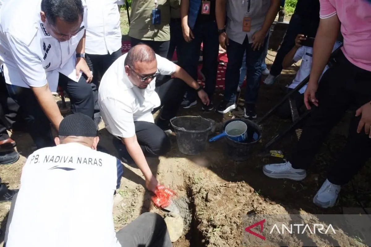Wakil Ketua Komisi VI DPR RI Andre Rosiade melakukan peletakan batu pertama pembangunan Manara BTS di Desa Sungai Rambai, Kecamatan Pariaman Utara, Pariaman, Rabu. Antara/HO-Diskominfo Pariaman