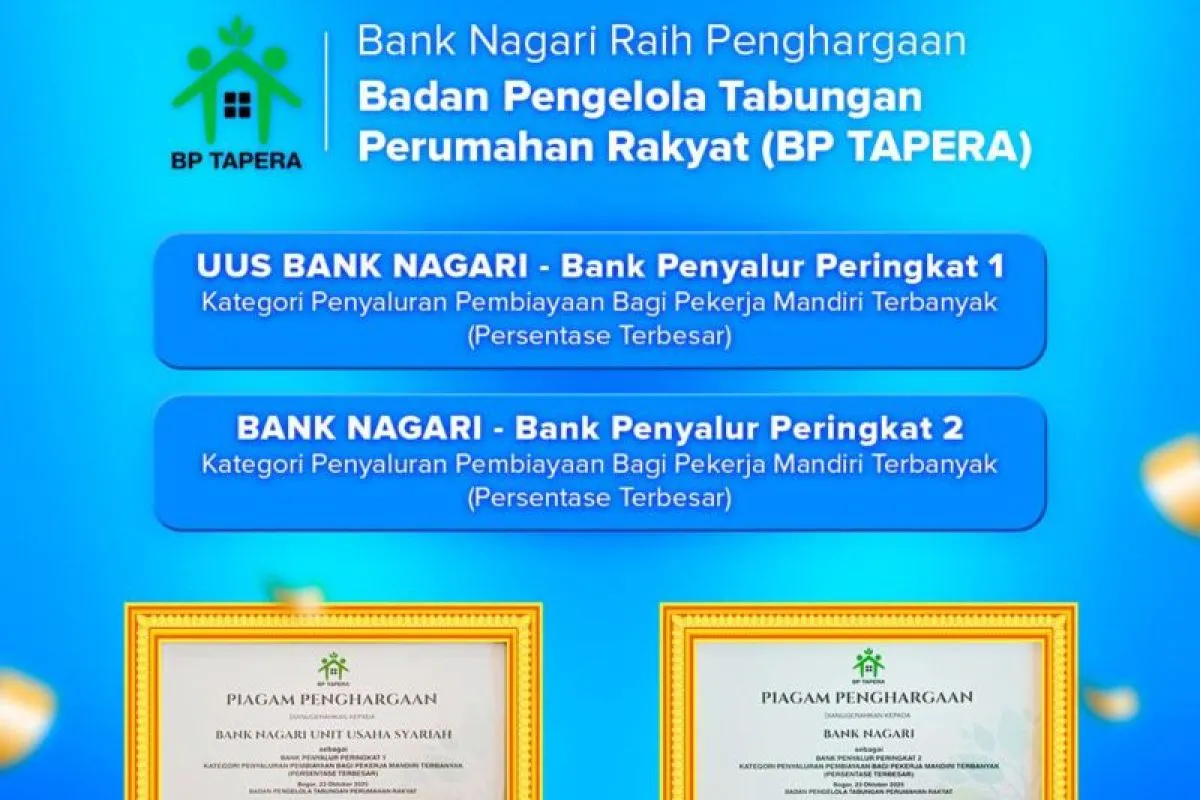 Padang (ANTARA) - Bank Nagari kembali menorehkan prestasi membanggakan di tingkat nasional. Pada kegiatan Rapat Evaluasi Bank Penyalur Quartal III Penyaluran Pembiayaan FLPP Tahun 2025 yang diselenggarakan oleh Badan Pengelola Tabungan Perumahan Rakyat (BP Tapera) di Bogor, 23 Oktober 2025, Bank Nagari berhasil meraih dua penghargaan bergengsi sekaligus.