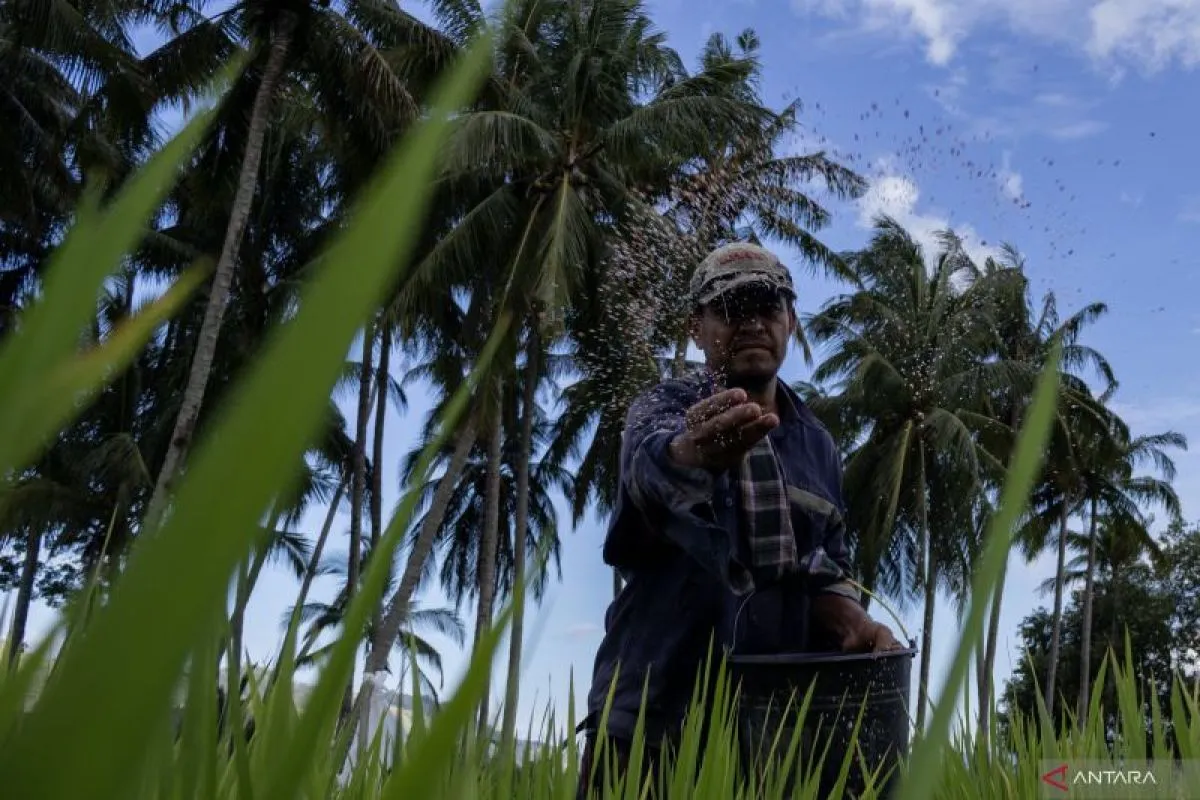 Kabupaten Tanah Datar (ANTARA) - Seorang petani menaburkan pupuk bersubsidi campuran NPK dan urea di areal persawahan Nagari Sumpur, Kecamatan Batipuh Selatan, Kabupaten Tanah, Provinsi Sumatera Barat, Sabtu (8/11/2025). Pada 20 Oktober 2025 untuk pertama kalinya dalam sejarah pemerintah menurunkan harga eceran tertinggi (HET) pupuk bersubsidi hingga 20 persen yang mulai berlaku pada 22 Oktober 2025.