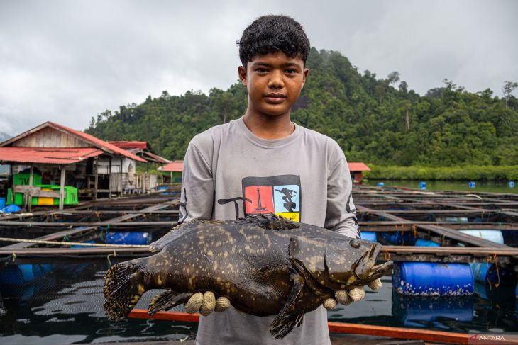 Pekerja menunjukkan ikan kerapu siap ekspor di salah satu pusat budi daya ikan kerapu di Sumatera Barat. ANTARA/Muhammad Zulfikar