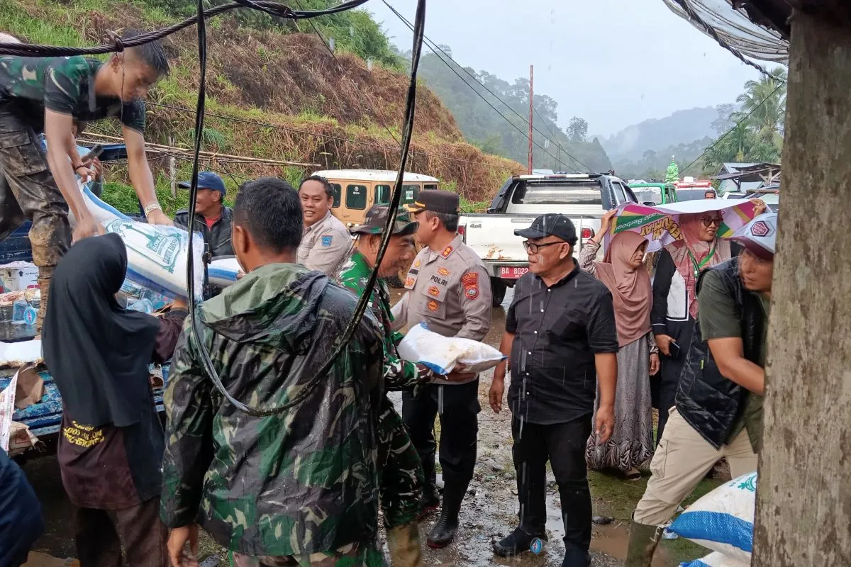 Bupati Pasaman Barat Yulianto bersama unsur forkopimda menyalurkan bantuan sembako kepada korban bencana alam di Kecamatan Talamau, Sabtu (29/11/2025). ANTARA/Altas Maulana.