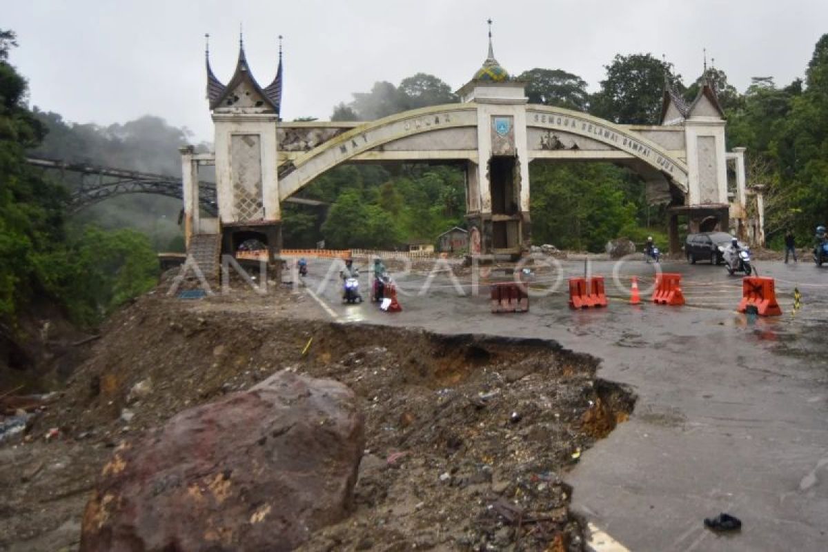 Sejumlah pengendara melintas di kawasan jembatan kembar Padang Panjang, Sumatera Barat, Rabu (10/12/2025). Kawasan jembatan kembar yang longsor dan terkena banjir bandang hingga memakan korban jiwa dua pekan lalu itu kini kondisinya sudah dibersihkan dan bisa dilewati kendaraan, namun sebagian jalan masih rusak.