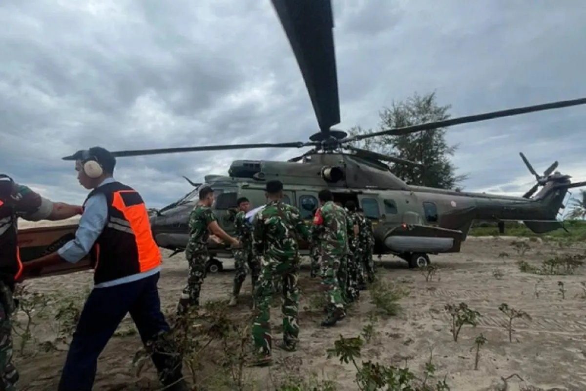 Di tengah keterbatasan akses darat, personel Lanud Sutan Sjahrir bersama kru helikopter bahu-membahu dengan warga setempat dalam proses penurunan dan pendistribusian logistik di lokasi sasaran.