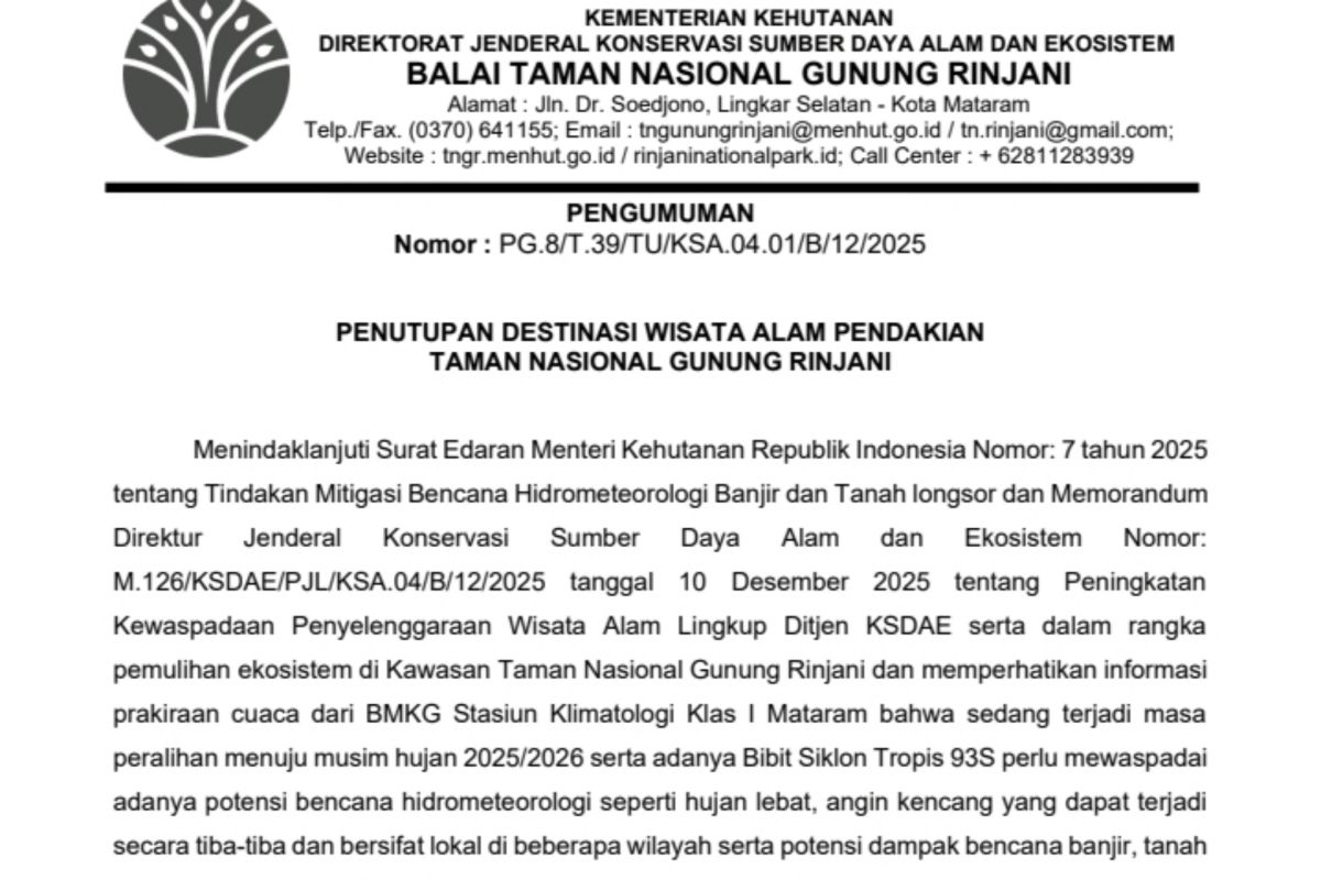 Mataram (ANTARA) - Balai Taman Nasional Gunung Rinjani (TNGR) menyatakan dalam rangka mitigasi risiko bencana hidrometeorologi dan pemulihan ekosistem, sehingga melakukan menutup sementara seluruh destinasi wisata pendakian di kawasan Gunung Rinjani Lombok, Nusa Tenggara Barat (NTB) pada awal 2026