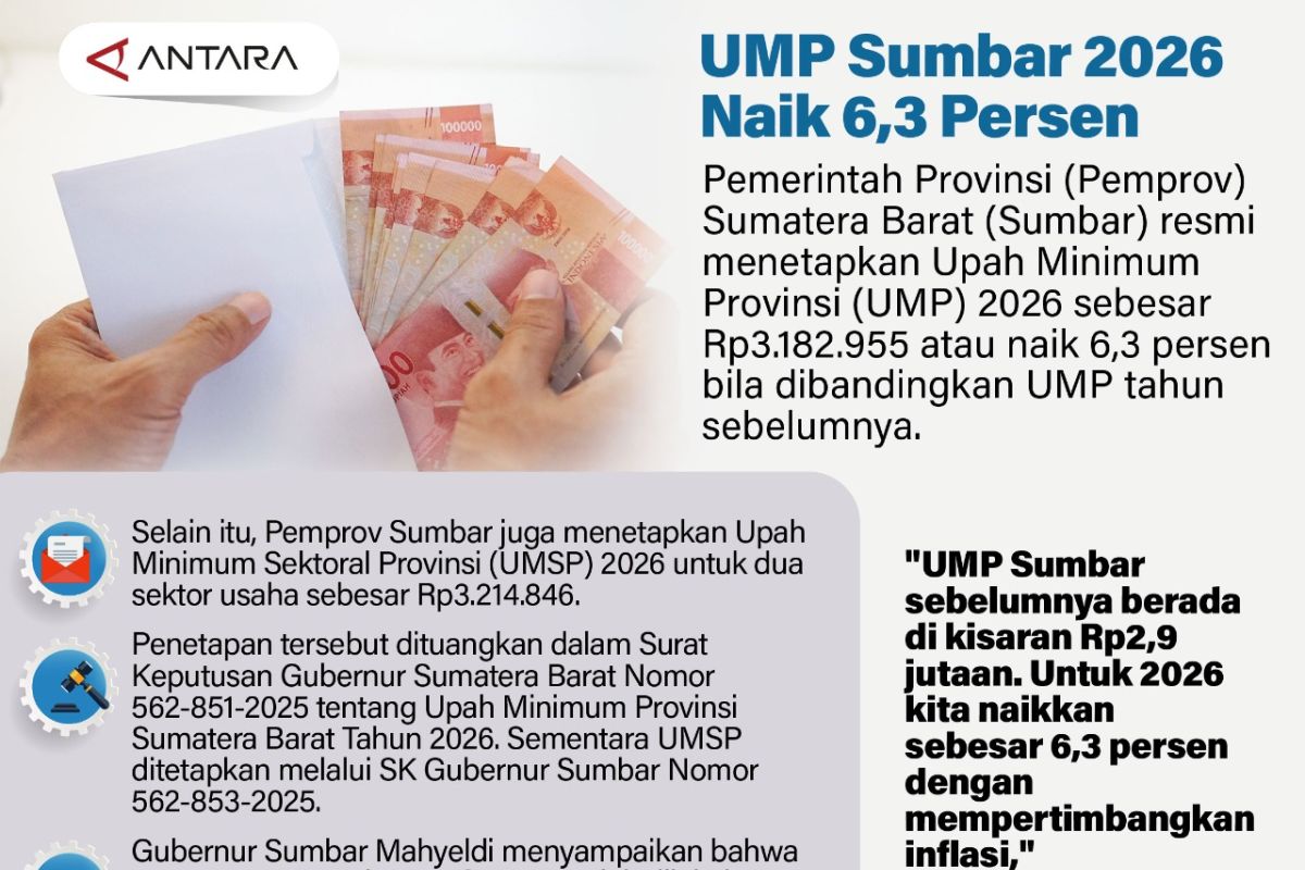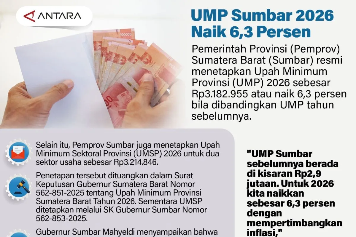 UMP Sumbar 2026 naik 6,3 persen id UMP Sumbar 2026 ,Pemprov) Sumatera Barat Selasa, 23 Desember 2025 15:01 WIB Padang (ANTARA) - Pemerintah Provinsi (Pemprov) Sumatera Barat (Sumbar) resmi menetapkan Upah Minimum Provinsi (UMP) 2026 sebesar Rp3.182.955 atau naik 6,3 persen bila dibandingkan UMP tahun sebelumnya.