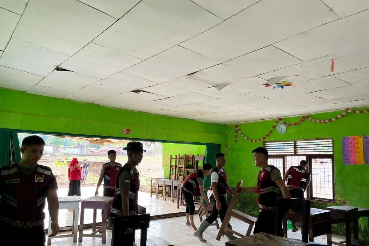 Dengan menggunakan pacul dan peralatan seadanya, personel Brimob mengeluarkan kursi dan meja dari dalam kelas sebelum membersihkan bagian dalam sekolah secara menyeluruh, agar aktivitas belajar mengajar dapat segera kembali berjalan.