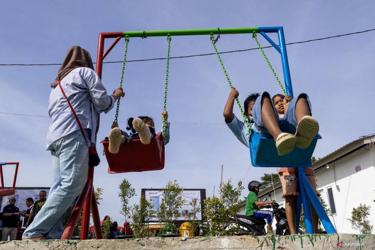 Sejumlah anak bermain ayunan di kawasan taman bermain Huntara yang dibangun Danantara di Kabupaten Padang Pariaman, Kamis (22/1/2026). ANTARA/Muhammad Zulfikar