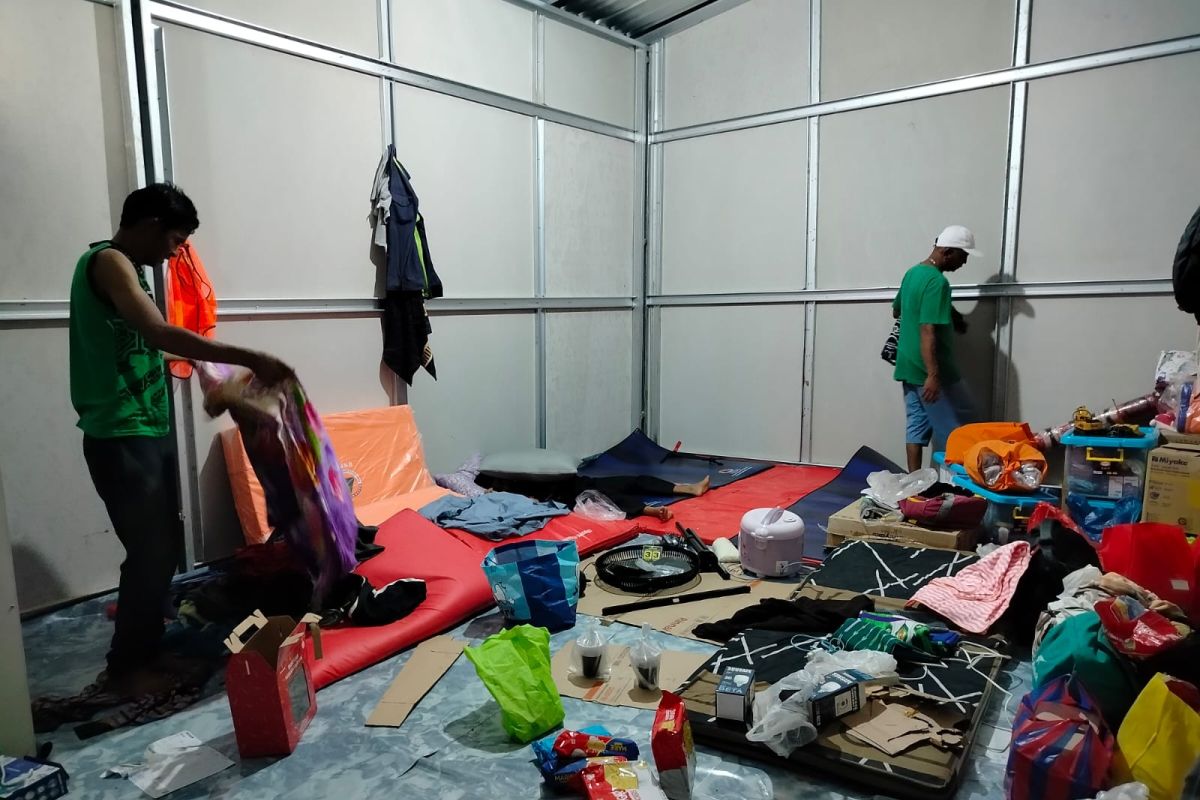 Sesampai di lokasi hunian sementara, mereka langsung menyusun barang-barang tersebut.
