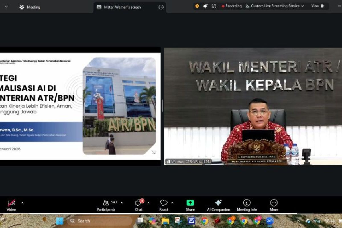 Jakarta (ANTARA) - Wakil Menteri Agraria dan Tata Ruang/Wakil Kepala Badan Pertanahan Nasional (Wamen ATR/Waka BPN), Ossy Dermawan, membuka webinar bertajuk Strategi Optimalisasi AI di Kementerian ATR/BPN: Kinerja Lebih Efisien, Aman, dan Bertanggung Jawab yang diselenggarakan oleh Badan Pengembangan Sumber Daya Manusia (BPSDM) Kementerian ATR/BPN, pada Kamis (29/1/2026).