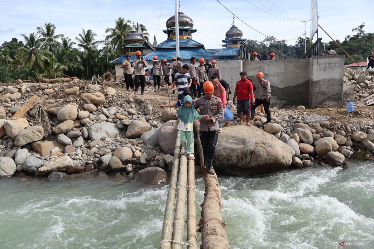 Kabupaten Agam (ANTARA) - Matahari mulai merangkak naik. Sekelompok orang dewasa dan beberapa anak-anak terlihat berbondong-bondong melintasi sebuah jembatan darurat yang terbuat dari sebatang pohon kelapa dan tiga batang pohon bambu betung (Dendrocalamus asper) di Nagari Salareh Aia, Kecamatan Palembayan, Kabupaten Agam, Sumatera Barat.