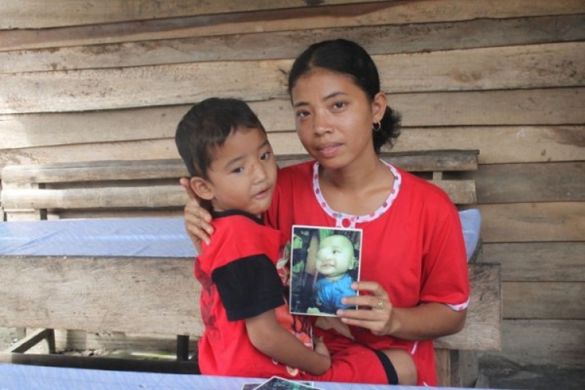 Depi Yunita (25) menggendong Muhammad Deri sambil melihatkan foto buah hatinya yang saat berumur enam bulan matanya tertutup tumor.