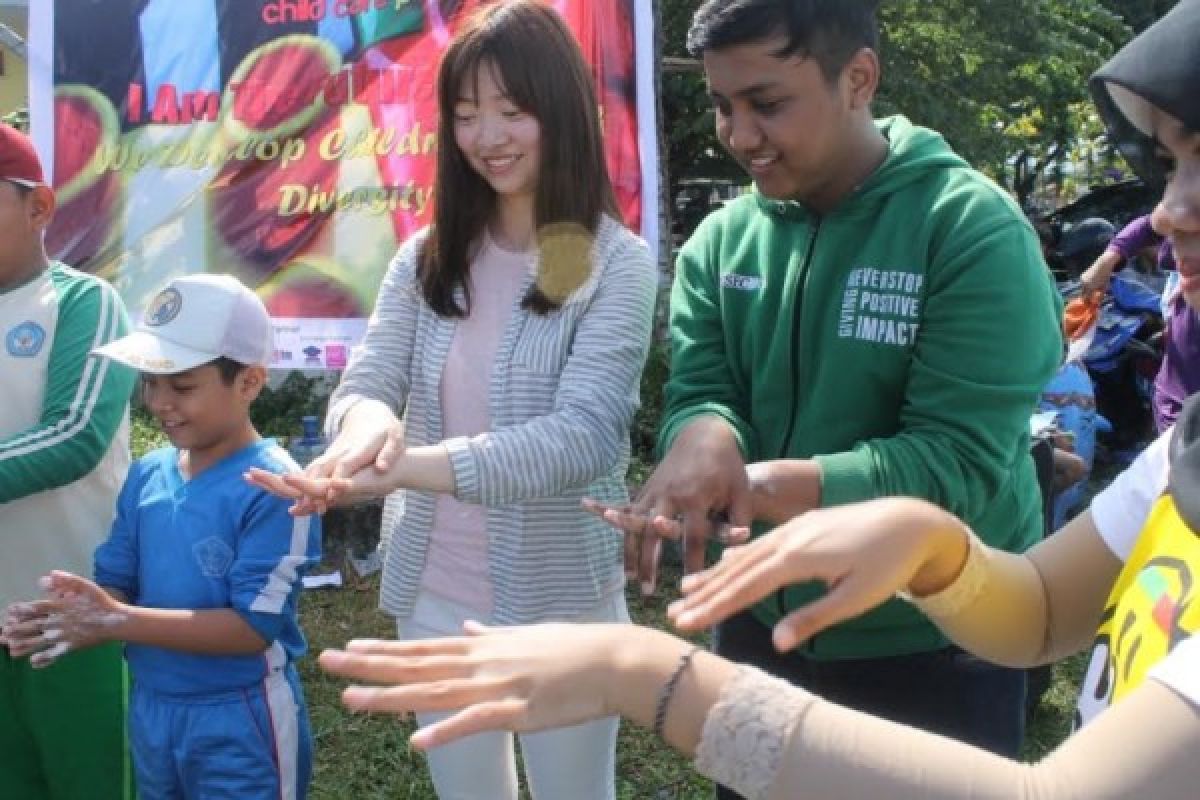 Salah satu kegiatan AISEC Unand, mengajari anak-anak senam cuci tangan.