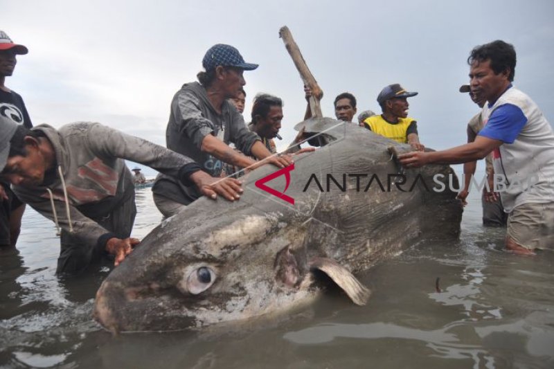 Warga mengamati ikan mola mola yang mati terdampar di Pantai Teluk Palu, Kelurahan Lere, Palu, Sulawesi Tengah, Selasa (24/4). Ikan dengan panjang lebih dari dua meter itu ditemukan nelayan dalam kondisi hidup, namun pada akhirnya mati setelah terjebak beberapa jam di perairan dangkal. Peristiwa terdamparnya ikan tersebut merupakan yang kesekian kali terjadi dalam tiga tahun terakhir. ANTARA FOTO/Mohamad Hamzah/kye/18.