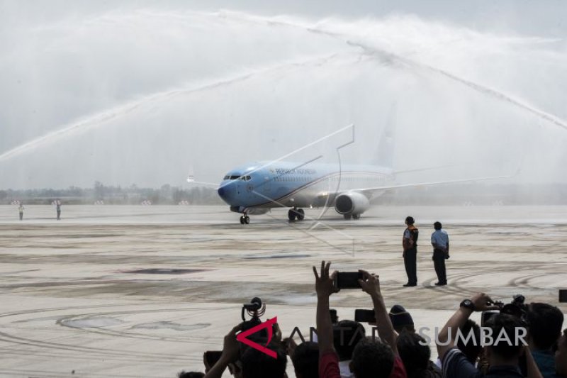 Pesawat Kepresidenan yang ditumpangi Presiden Joko Widodo dan rombongan disambut prosesi water salute (penyiraman air) saat mendarat di Bandara Internasional Jawa Barat (BIJB) Kertajati, Majalengka, Jawa Barat, Kamis (24/5). Pesawat tersebut merupakan pesawat pertama yang mendarat di BIJB Kertajati dalam rangka kunjungan kerja Presiden di Jawa Barat selama dua hari. ANTARA FOTO/M Agung Rajasa/foc/18.