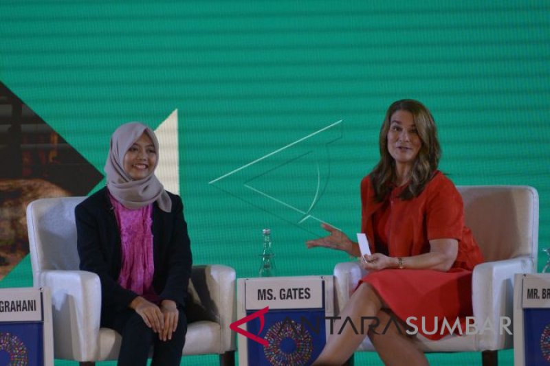 Relawan fasilitator remaja Indonesia Nur Wulan Nugrahani (kiri) bersama Ketua Bill & Melinda Gates Foundation Melinda Gates (kanan) berdiskusi dengan peserta sesi panel Global Financing Facility (GFF), rangkaian Pertemuan Tahunan IMF - World Bank Group 2018 di Nusa Dua, Bali, Kamis (11/10). Diskusi tersebut menghadirkan para pemimpin pembangunan perwakilan dari negara-negara GFF dan remaja tentang bagaimana investasi dalam kesehatan dan gizi wanita, anak-anak dan remaja dapat mempercepat kemajuan. ANTARA FOTO/ICom/AM IMF-WBG/Nyoman Budhiana/wsj/2018.
