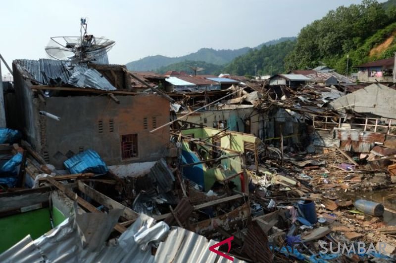 Kondisi lokasi rumah terduga teroris dan juga rumah warga rusak akibat ledakan bom bunuh diri yang dilakukan Solimah istri terduga teroris Husain alias Abu Hamzah, di Kecamatan Sibolga Sambas, Sibolga, Sumatera Utara, Sabtu (16/3/2019). Aksi bom bunuh diri yang dilakukan Solimah pada Rabu (13/3) dini hari saat upaya penangkapan oleh Densus 88 tersebut menyebabkan sedikitnya 151 rumah warga rusak berat, sedang dan ringan. ANTARA FOTO/Irsan Mulyadi/aww.
