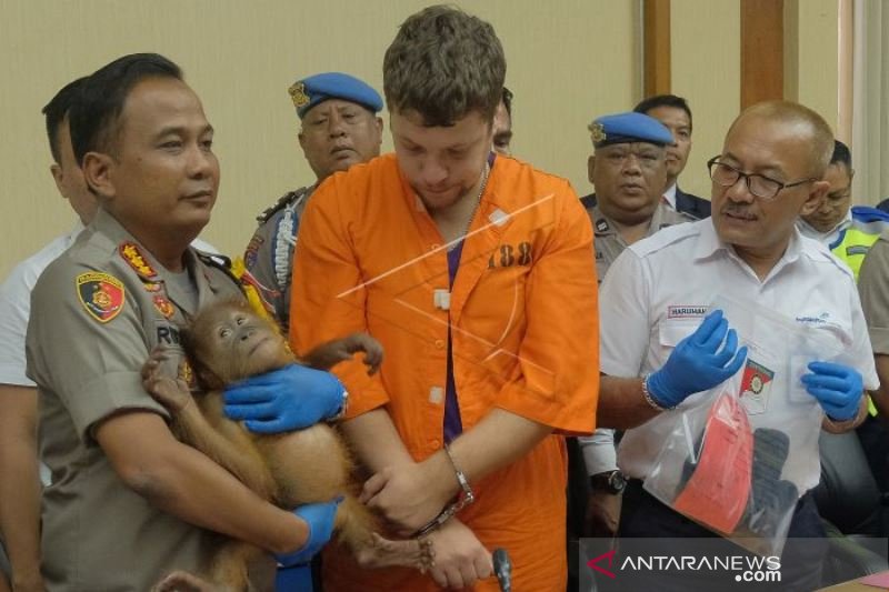 Kapolresta Denpasar, Kombes Pol Ruddi Setiawan (kiri) memperlihatkan orangutan yang hendak diselundupkan oleh warga negara Rusia Zhestkov Andrei (tengah), dalam konferensi pers di Gedung Wisti Sabha Angkasa Pura, Badung, Bali, Senin (25/3/2019). Warga negara Rusia tersebut ditangkap pada Jumat (22/3) di Bandara Ngurah Rai karena berupaya menyelundupkan orangutan untuk dijual di negaranya sehingga terancaman hukuman lima tahun penjara dengan denda mencapai Rp100 juta. ANTARA FOTO/Nyoman Hendra Wibowo/nym/foc.
