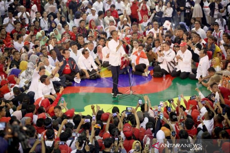 Calon Presiden nomer urut 01 Joko Widodo berorasi pada kampanye terbuka di Palembang,Sumsel, Selasa (2/4/2019). Kampanye Capres 01 ini dihadiri ribuan pendukung dari berbagai kabupaten dan kota di Provinsi Sumsel. ANTARA FOTO/Feny Selly/hp.