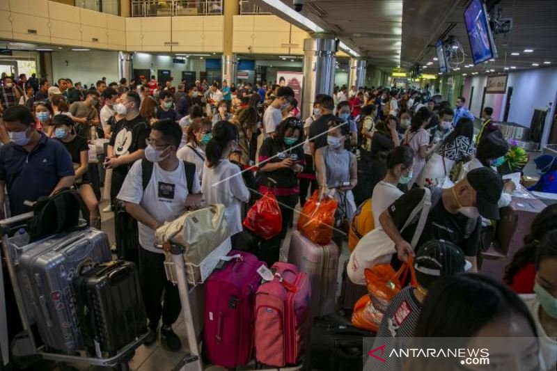 Sejumlah wisatawan asing asal China antre di konter lapor diri (check-in) Terminal Keberangkatan Bandara Hang Nadim, Batam, Kepulauan Riau, Selasa (28/1/2020). Agen biro perjalanan China memulangkan ratusan wisatawannya yang sedang berkunjung di Batam menyusul merebaknya wabah virus Korona, selain itu pihak Bandara Hang Nadim juga menghentikan sementara penerbangan dari China ke Batam sampai batas waktu yang belum ditentukan. ANTARA FOTO/M N Kanwa/wsj.
