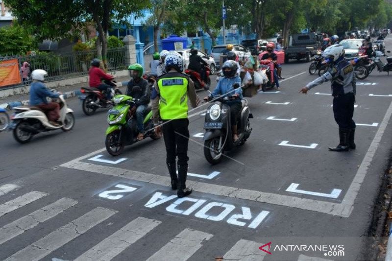 Petugas Dinas Perhubungan dan polisi Satuan Lalu Lintas (Satlantas) mengarahkan pengendara motor berhenti di belakang garis untuk menjaga jarak antarpengendara di Jalan Wahid Hasyim Kabupaten Jombang, Jawa Timur, Rabu (15/7/2020). Kepolisian dan Dinas Perhubungan setempat membuat garis tersebut untuk membatasi jarak antarpengendara guna mencegah penyebaran COVID-19. ANTARA FOTO/Syaiful Arif/aww.