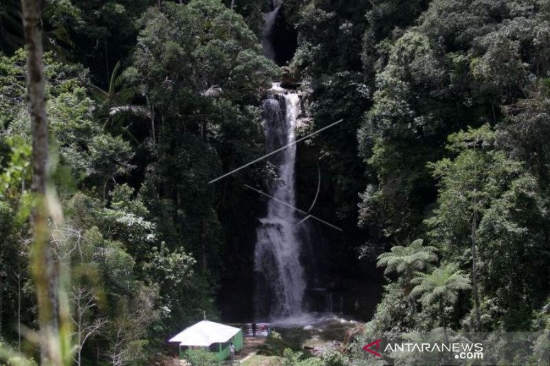 Sejumlah wisatawan menikmati keindahan objek wisata Sarasah (Air Terjun) tiga tingkat di Pasia Laweh Sungai Guntuang, Palupuh, Kabupaten Agam, Sumatera Barat, Kamis (23/7/2020). Objek wisata tersebut kembali dibuka bagi pengunjung dengan menerapkan protokol kesehatan. ANTARA FOTO/Muhammad Arif Pribadi/aww.