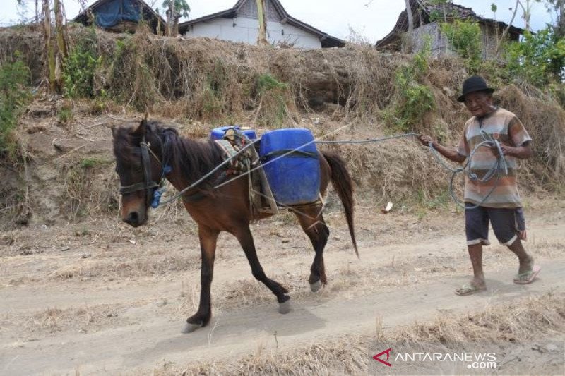 Warga menggunakan kuda untuk membawa air bersih yang didistribusikan di Desa Jatisari, Arjasa, Situbondo, Jawa Timur, Jumat (9/10/2020). BPBD Situbondo mendistribusikan air bersih ke tiga kecamatan yaitu Kecamatan Arjasa, Mlandingan dan Kendit yang warganya mengalami kesulitan air bersih. ANTARA FOTO/Seno/wsj.