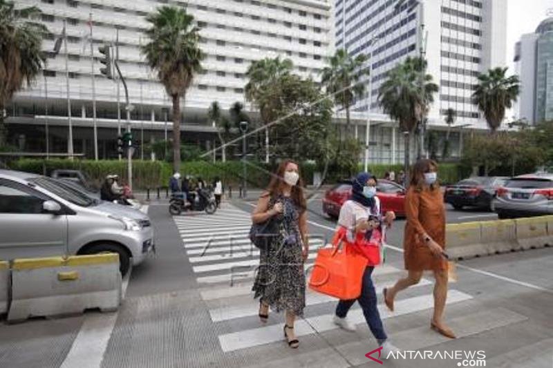 Sejumlah pejalan kaki menyeberangi zebra cross di Jakarta, Senin (21/12/2020). Gubernur DKI Jakarta Anies Baswedan resmi memperpanjang Pembatasan Sosial Berskala Besar (PSBB) Masa Transisi selama dua pekan, terhitung sejak 21 Desember 2020 hingga 3 Januari 2021. ANTARA FOTO/ Reno Esnir/aww.