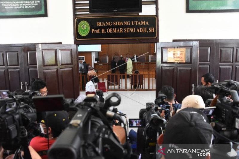 Tim kuasa hukum Muhammad Rizieq Shihab menyiapkan berkas persidangan praperadilan yang dipimpin hakim tunggal Akhmad Sayuti (kedua kanan) di Pengadilan Negeri Jakarta Selatan, Senin (4/1/2021). Sidang gugatan praperadilan perdana tersebut terkait penetapan tersangka Muhammad Rizieq Shihab dalam kasus penghasutan kerumunan massa yang terjadi di Petamburan pada 10 November 2020 lalu. ANTARA FOTO/Indrianto Eko Suwarso/hp.