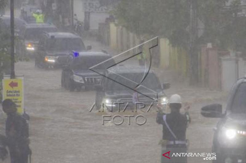 Presiden Joko Widodo yang berada di dalam mobil kepresidenan melintasi banjir di Desa Pekauman Ulu, Kabupaten banjar, Kalimantan Selatan, Senin (18/1/2021). Kunjungan kerja tersebut dalam rangka melihat langsung dampak banjir dan meninjau posko pengungsian korban banjir di Provinsi Kalimantan Selatan. ANTARA FOTO/Bayu Pratama S/aww.