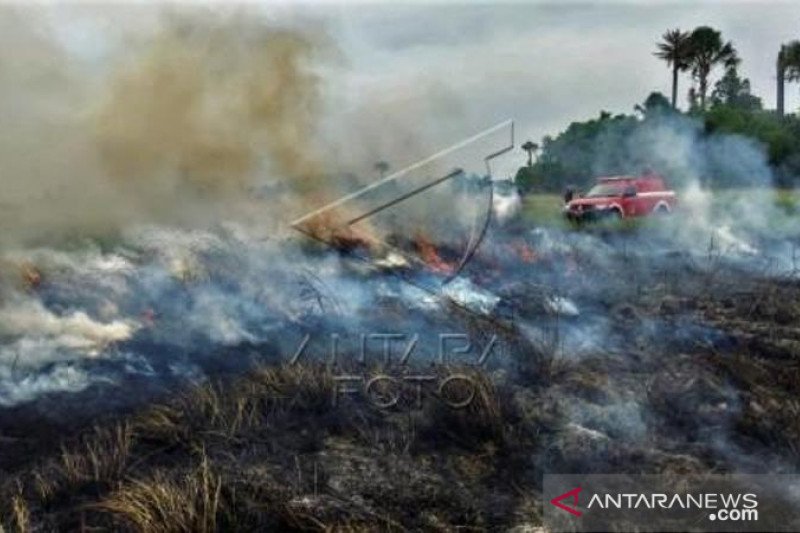 Personel Manggala Aqni Daerah Operasi Sulawesi Tenggara berusaha memadamkan api yang membakar lahan di Taman Nasional Rawa Aopa Watumohai, Kabupaten Bombana, Sulawesi Tenggara, Minggu (31/1/2021). Kawasan ekosistem savana Taman Nasional Rawa Aopa Watumohai terbakar sekitar 17 Hektare sejak Senin (25/1/2021), sementara pada Minggu (31/1/2021) pihak Balai Taman Nasional Rawa Aopa Watumohai (TNRAW) baru memperbolehkan pihak Manggala Aqni melakukan pemadaman Karhutla. ANTARA FOTO/Manggala Agni/Jjn/hp.