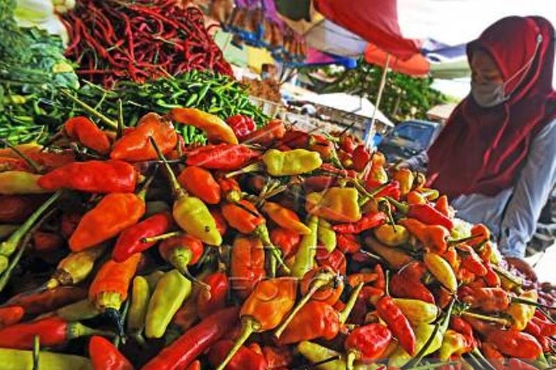 Seorang Ibu rumah tangga memilih cabai rawit di Pasar Induk Rau Serang, Banten, Selasa (9/3/2021). Menurut pedagang setempat harga cabai rawit melonjak naik sejak dua hari terakhir dari Rp70 ribu menjadi Rp125 ribu per kilogram akibat pasokan berkurang dampak cuaca buruk. ANTARA FOTO/Asep Fathulrahman/hp.