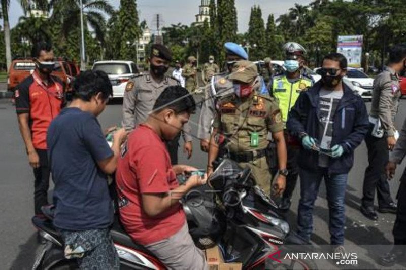 Petugas Satgas COVID-19 merazia sekaligus memberikan masker gratis kepada pengendara sepeda motor yang tidak menggunakan masker di Alun-alun Kabupaten Ciamis, Jawa Barat, Rabu (10/3/2021). Razia tersebut untuk meningkatkan kedisiplinan warga menggunakan masker dan mematuhi protokol kesehatan sebelum dilakukan vaksinasi COVID-19. ANTARA FOTO/Adeng Bustomi/hp.