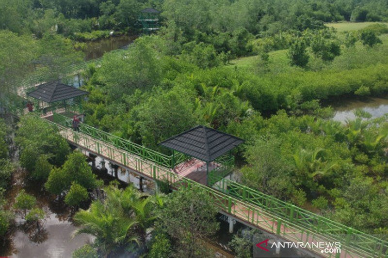 Foto udara pengunjung menikmati treking mangrove di Desa Apar, Kota Pariaman, Sumatera Barat, Minggu (28/3/2021). Badan Usaha Milik Desa (Bumdes) Apar dengan bantuan dari Kementerian Kelautan dan Perikanan membuka treking mangrove tersebut sebagai upaya menjaga dan melestarikan hutan mangrove dan mewujudkan destinasi wisata baru yang akan berdampak pada perekonomian masyarakat. ANTARA FOTO/Iggoy el Fitra/foc.