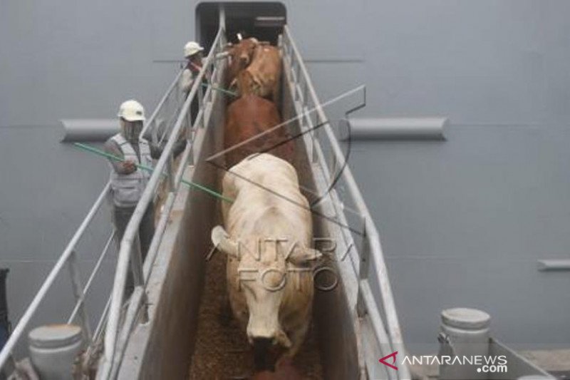 Petugas menurunkan sapi impor dari Australia di Pelabuhan Tanjung Priok, Jakarta, Kamis (15/4/2021). Badan Ketahanan Pangan Kementerian Pertanian memastikan pasokan komoditas pangan yang dipenuhi lewat impor yaitu daging sapi dan kerbau, bawang putih serta gula dalam kondisi memadai sampai berakhirnya Ramadhan. ANTARA FOTO/Akbar Nugroho Gumay/rwa.