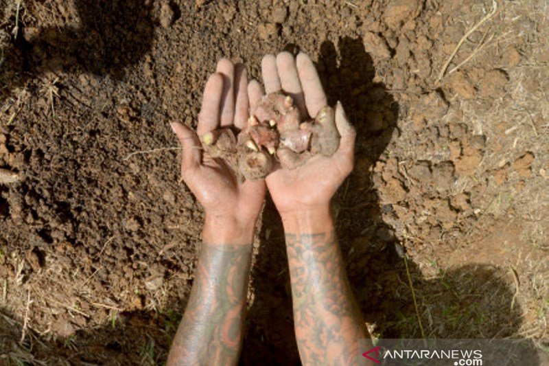 Mantan pecandu narkoba menunjukan bibit jahe merah yang akan ditanam, saat pelatihan budidaya jahe merah di Kampung KB Bukit Karan Rawang, Padang, Sumatera Barat, Kamis (3/6/2021). Badan Narkotika Nasional Provinsi (BNNP) Sumbar bekerjasama dengan perusahaan minuman herbal memberikan pelatihan budidaya jahe merah bagi mantan pecandu narkoba dan penyalahgunaan narkotik, sebagai upaya mewujudkan daerah itu bersih narkoba, sekaligus menimbulkan dampak produktif serta menjadikan jahe merah sebagai produk unggulan. ANTARA FOTO/Iggoy el Fitra/foc.