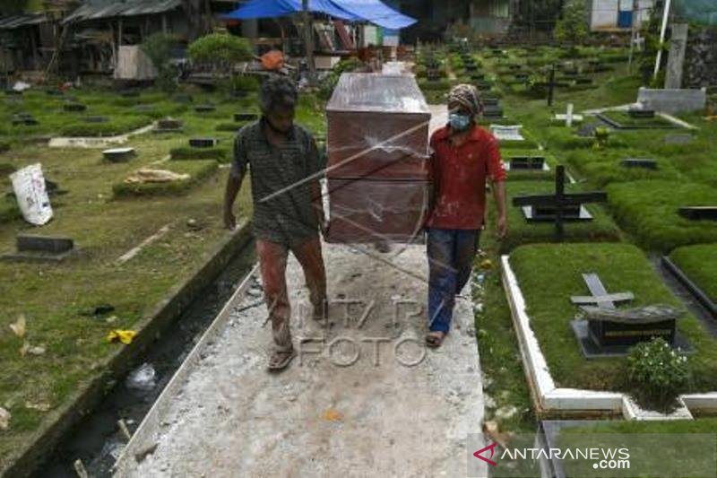 Pekerja menyelesaikan pembuatan peti mati di Yayasan Sahabat Duka, di TPU Pondok Kelapa, Jakarta, Senin (28/6/2021). Pekerja mengatakan permintaan peti mati meningkat sebulan terakhir dengan produksi 20 hingga 30 peti per-hari untuk memenuhi permintaan rumah sakit rujukan COVID-19 di DKI Jakarta. ANTARA FOTO/Galih Pradipta/foc.
