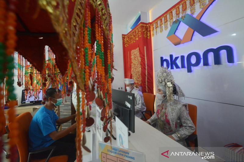 Petugas Badan Karantina Ikan, Pengendalian Mutu dan Keamanan (BKIPM), menggunakan pakaian adat Minangkabau sambil melayani pengguna jasa, di Kantor BKIPM Padang, di Padangpariaman, Sumatera Barat, Kamis (1/7/2021). Dalam rangka Pekan Pelayanan Publik Bulan Mutu Karantina, BKIPM Padang memberikan pelayanan publik menggunakan pakaian tradisional Minang sekaligus memperkenalkan Aplikasi Siudauni bagi pengguna jasa agar dapat mengajukan permohonan uji labor dari rumah. ANTARA FOTO/Iggoy el Fitra/IWY.