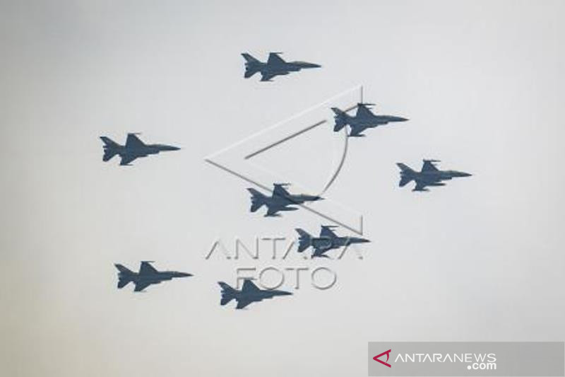 Sejumlah pesawat tempur TNI Angkatan Udara terbang membentuk formasi di Jakarta, Jumat (13/8/2021). Formasi terbang tersebut merupakan latihan persiapan untuk puncak peringatan hari ulang tahun ke-76 Republik Indonesia pada tanggal 17 Agustus 2021. ANTARA FOTO/Aditya Pradana Putra/hp.