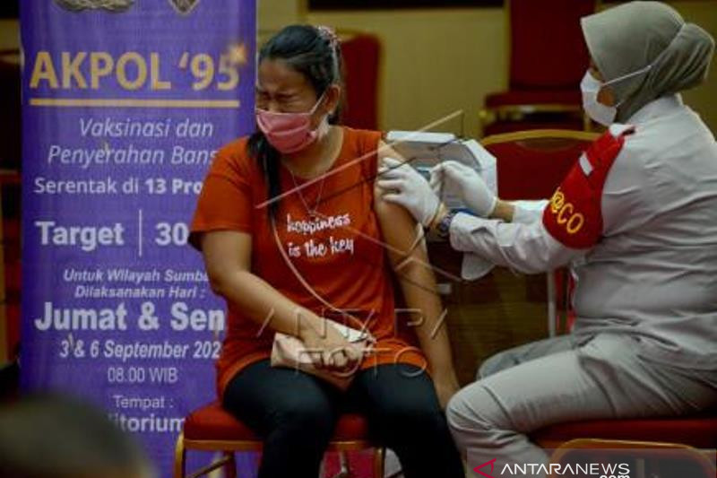 Petugas kesehatan menyuntikkan vaksin COVID-19 kepada warga di Kampus Universitas Negeri Padang (UNP), Padang, Sumatera Barat, Jumat (3/9/2021). Akpol 95 Patriatama menggelar vaksinasi serentak COVID-19 di 13 provinsi dengan target 40 ribu orang dan pembagian 27 ribu bantuan sosial (bansos) khususnya bagi akademisi, mahasiswa, dan warga di lingkungan Kampus UNP. ANTARA FOTO/Iggoy el Fitra/wsj.