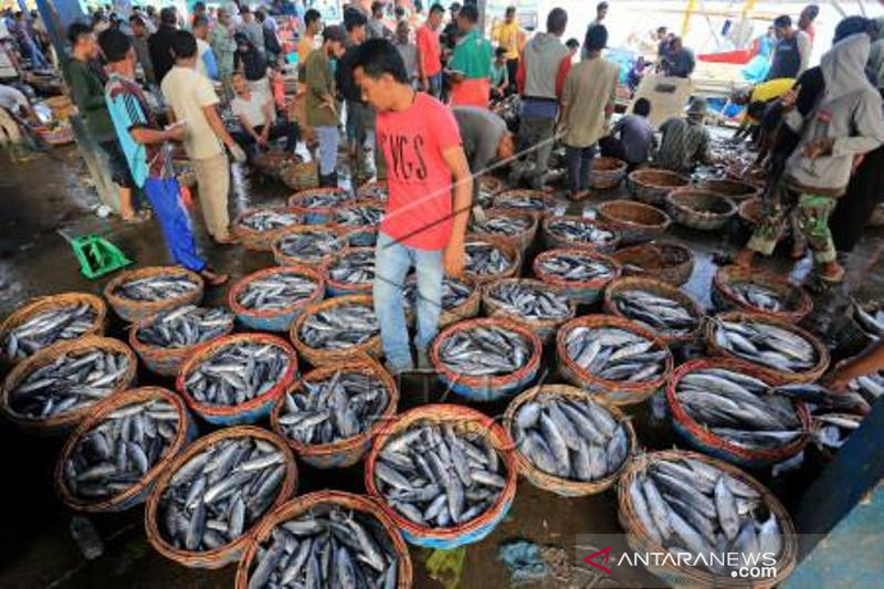 Sejumlah pekerja menata keranjang berisi ikan sebelum didistribusikan di Pelabuhan Perikanan Samudera, Lampulo, Banda Aceh, Aceh, Selasa (7/9/2021). Provinsi Aceh memiliki potensi perikanan hingga 180.000 ton lebih pertahun yang dapat dimanfaatkan sebagai bahan baku untuk berbagai produk UMKM sebagai upaya mendukung program Gerakan Nasional Bangga Buatan Indonesia (Gernas BBI). ANTARA FOTO/Syifa Yulinnas/hp.