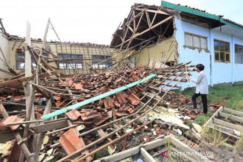 Seorang warga melihat reruntuhan bangunan laboratorium biologi yang ambruk di SMAN 1 Lelea, Indramayu, Jawa Barat, Rabu (15/9/2021). Dua ruangan laboratorium dan satu ruangan perpustakaan di sekolah itu ambruk akibat tidak kuat menahan guyuran hujan deras dan angin kencang. ANTARA FOTO/Dedhez Anggara/wsj.