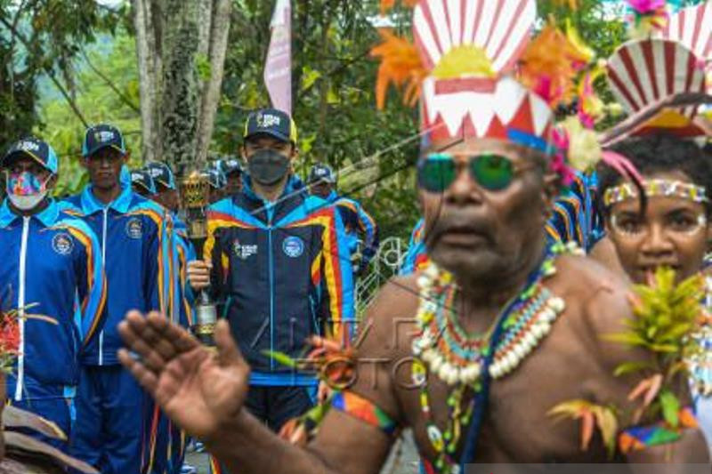 Mantan atlet bulu tangkis Taufik Hidayat (kanan) dan pesepak bola Boaz Solossa (kiri) bersiap melakukan kirab Api PON Papua di kawasan Kantor Wali Kota Jayapura, Papua, Jumat (1/10/2021). Api PON Papua tiba di Kota Jayapura dan dikirab di pusat kota dan akan dilanjutkan menuju Kabupaten Jayapura. ANTARA FOTO/Indrayadi TH/wsj.