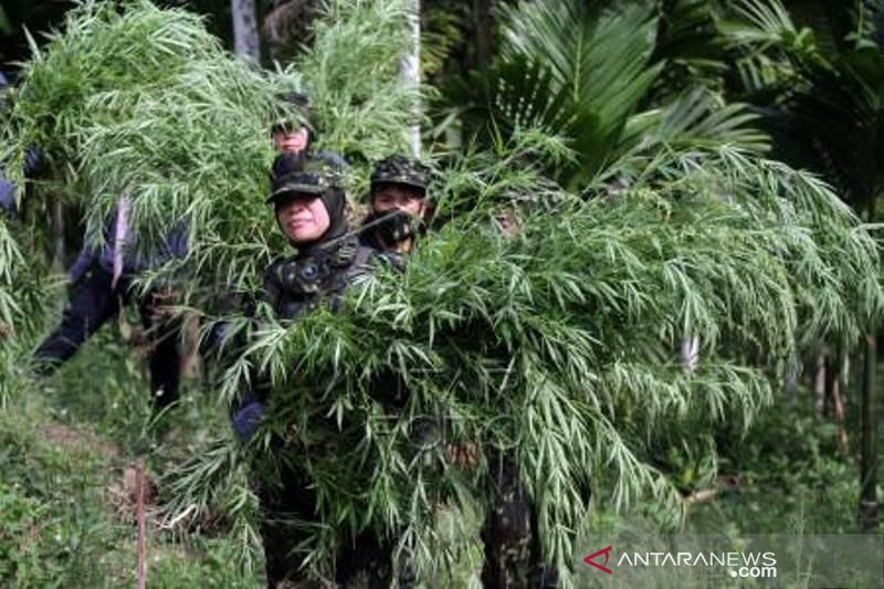 Petugas Badan Narkotika Nasional (BNN) mengangkut batang ganja saat penggerebekan ladang ganja di Dusun Cot Lawatu, Sawang, Kabupaten Aceh Utara, Aceh, Rabu (13/10/2021). Dalam penggerebekan yang dilakukan 103 personel BNN, TNI, Polisi itu ditemukan 5.000 lebih tanaman ganja atau setara 3 ton batang pohon ganja siap panen dan 20 ribu bibit siap tanam di tiga lokasi (3 hektare) yang kemudian dimusnahkan dengan cara dibakar di tempat. ANTARA FOTO/Rahmad/aww.