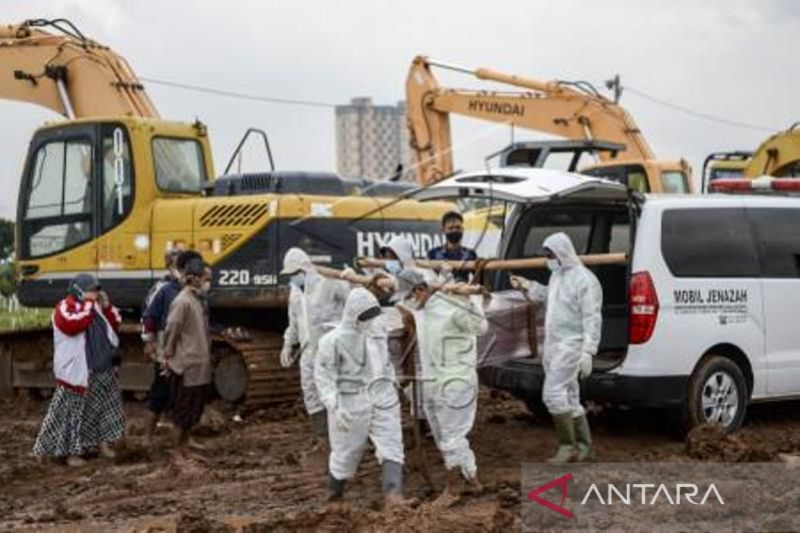 Sejumlah petugas mengusung peti jenazah pasien COVID-19 di TPU Rorotan, Jakarta, Kamis (10/2/2022). Menurut data Pemprov DKI Jakarta meski persentase kasus positif COVID-19 akibat varian Omicron meningkat, angka kematian akibat COVID-19 sekitar 30 orang per hari walaupun angka kematian ini jauh lebih rendah dibandingkan saat varian Delta. ANTARA FOTO/M Risyal Hidayat/nz