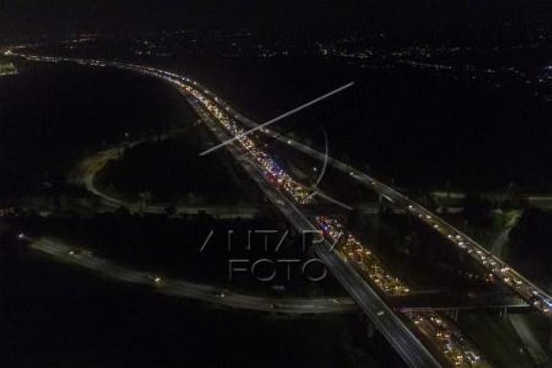 Foto udara kendaraan memadati Jalan Tol Jakarta - Cikampek, Karawang, Jawa Barat, Rabu (27/4/2022) dini hari. PT Jasa Marga memprediksi puncak peningkatan volume lalu lintas arus mudik melalui jalan tol akan terjadi pada H-3 Lebaran atau tanggal 29 April 2022. ANTARA FOTO/M Ibnu Chazar/rwa.