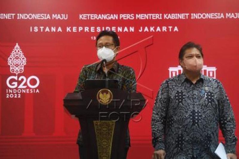 Menteri Kesehatan Budi Gunadi Sadikin (kiri) menyampaikan keterangan pers disaksikan Menko Perekonomian Airlangga Hartarto (kanan) usai mengikuti rapat terbatas terkait PPKM di Kantor Presiden, Jakarta, Senin (13/6/2022). Pemerintah mengonfirmasi temuan delapan kasus varian baru COVID-19 yaitu BA.4 dan BA.5 di Indonesia dimana tiga diantaranya adalah kasus kedatangan luar negeri sementara lima sisanya merupakan penularan transmisi lokal. ANTARA FOTO/Akbar Nugroho Gumay/tom.