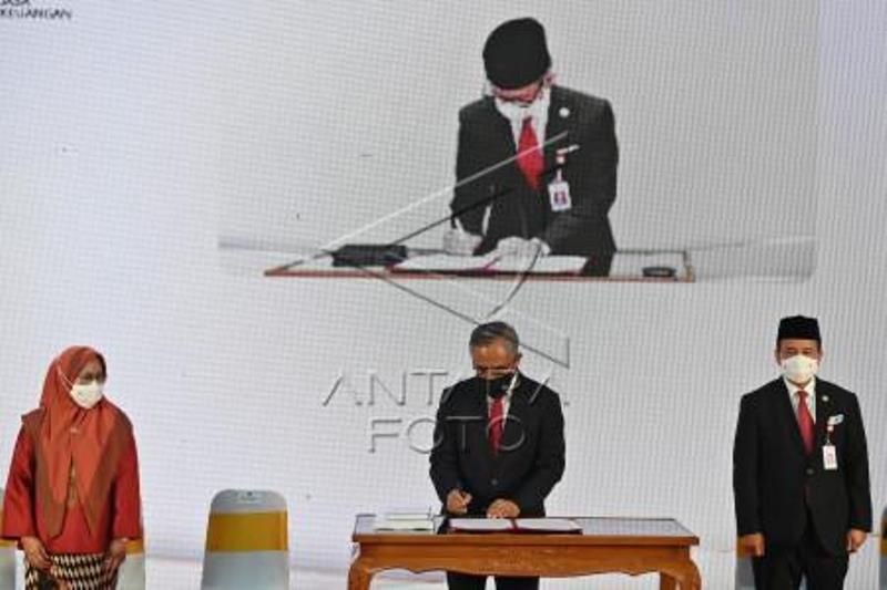 Ketua Dewan Komisioner OJK periode 2022-2027 Mahendra Siregar (atas) dan Ketua Dewan Komisioner OJK periode 2017-2022 Wimboh Santoso (bawah, tengah) menandatangani naskah serah terima jabatan di Kantor OJK, Jakarta, Rabu (20/7/2022). Sembilan anggota Dewan Komisioner OJK periode 2022-2027 resmi dilantik, antara lain Mahendra Siregar sebagai Ketua Dewan Komisioner, Mirza Adityaswaraa sebagai wakil ketua, Dian Ediana Rae, Inarno Djajadi, Ogi Prastomiyono, Sophia Issabela Watimena, Friderica Widyasari Dewi, Doni Primanto Joewono, dan Suahasil Nazara sebagai anggota komisioner. ANTARA FOTO/Aditya Pradana Putra/aww.