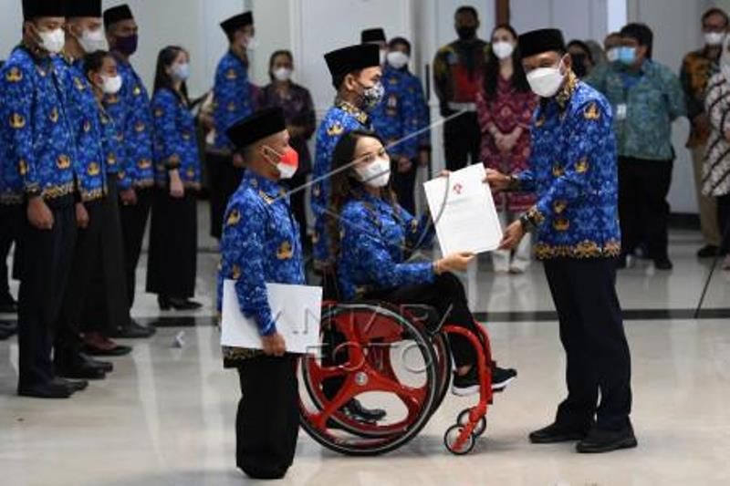 Menteri Pemuda dan Olahraga Zainudin Amali (kanan) memberikan surat keputusan pengangkatan sebagai Pegawai Negeri Sipil (PNS) kepada Lifter Ni Nengah Widiasih (kedua kanan) di Kemenpora, Jakarta, Rabu (10/8/2022). Pemerintah mengangkat sebanyak 193 atlet berprestasi, di antaranya 57 atlet difabel dan 136 atlet nondifabel, menjadi PNS sebagai wujud terima kasih atas prestasi para atlet sekaligus untuk memotivasi agar dapat lebih berprestasi di kancah internasional, khususnya Olimpiade dan Parilimpiade. ANTARA FOTO/Aditya Pradana Putra/foc.