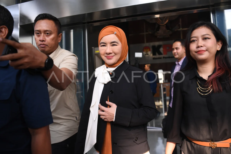 Direktur Utama PT Pertamina (Persero) Nicke Widyawati (tengah) meninggalkan gedung KPK usai menjalani pemeriksaan di Jakarta, Kamis (26/10/2023). KPK memeriksa Nicke sebagai saksi kasus dugaan korupsi pengadaan gas alam cair (LNG) tahun 2011-2021 dengan tersangka mantan Dirut Pertamina Karen Agustiawan. ANTARA FOTO/Akbar Nugroho Gumay/nym.